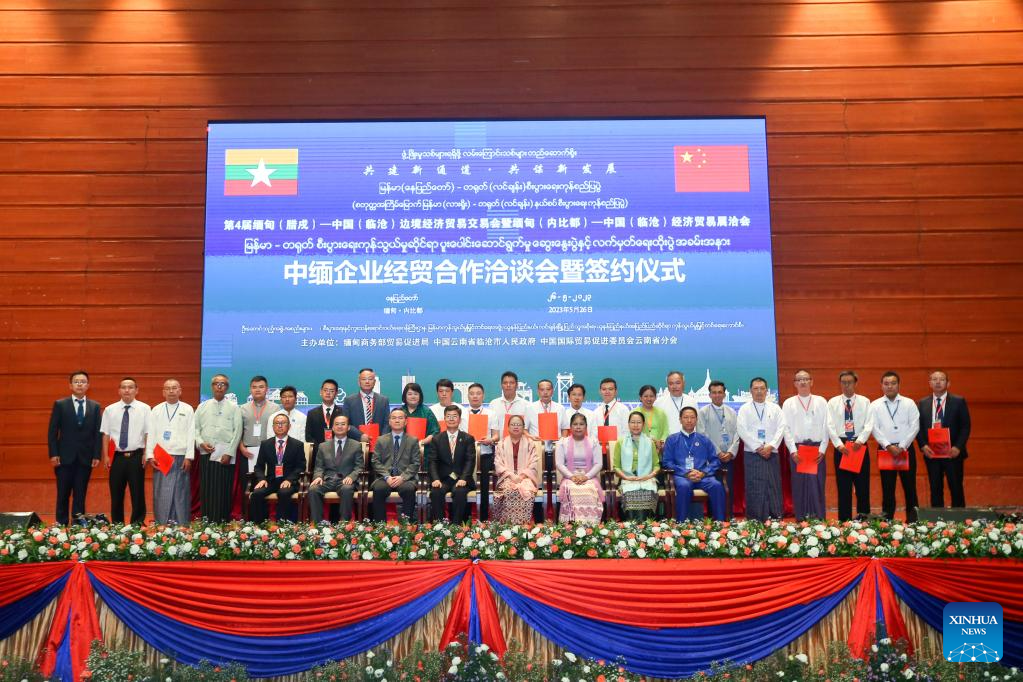 Representatives from Myanmar and China attend a signing ceremony of business agreements during a forum on Myanmar-China trade cooperation in Nay Pyi Taw, Myanmar, on May 26, 2023. (Photo by Myo Kyaw Soe/Xinhua)