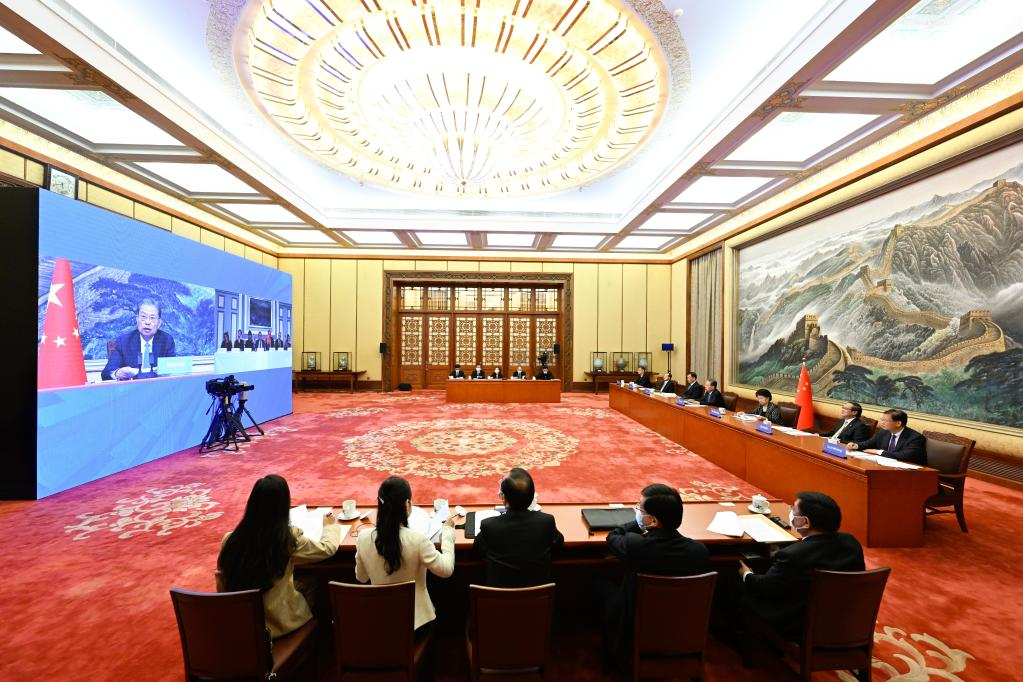 Zhao Leji, chairman of the National People's Congress Standing Committee, holds talks with the Speaker of the Parliament of Iceland Birgir Armannsson via video link, at the Great Hall of the People in Beijing, capital of China, May 26, 2023. (Xinhua/Shen Hong)