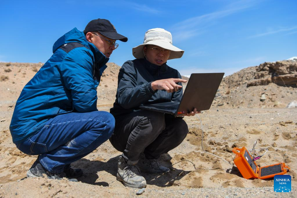 Researchers conduct research work in the Kumkol Basin in the east of the Kunlun Mountains, northwest China's Xinjiang Uygur Autonomous Region, May 22, 2023. Recently, researchers from the Xinjiang Institute of Ecology and Geography under the Chinese Academy of Sciences have launched a scientific expedition to investigate water resources on the northern slope of the Kunlun Mountains. (Xinhua/Ding Lei)