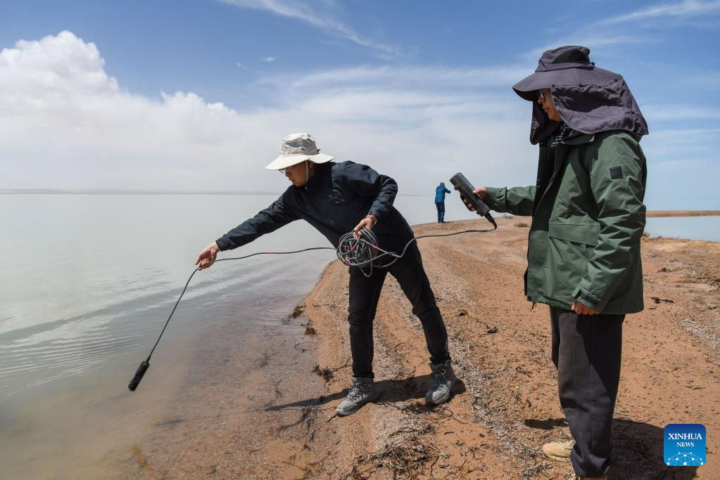 Researchers test the water quality in the Kumkol Basin in the east of the Kunlun Mountains, northwest China's Xinjiang Uygur Autonomous Region, May 23, 2023. Recently, researchers from the Xinjiang Institute of Ecology and Geography under the Chinese Academy of Sciences have launched a scientific expedition to investigate water resources on the northern slope of the Kunlun Mountains. (Xinhua/Ding Lei)