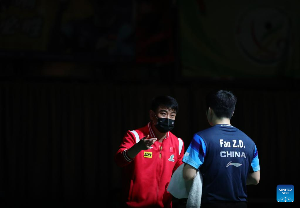 Fan Zhendong (R) of China talks to his coach Wang Hao during the men's singles quarterfinal against Omar Assar of Egypt at 2023 ITTF Table Tennis World Championships Finals in Durban, South Africa, May 26, 2023. (Xinhua/Wang Dongzhen)