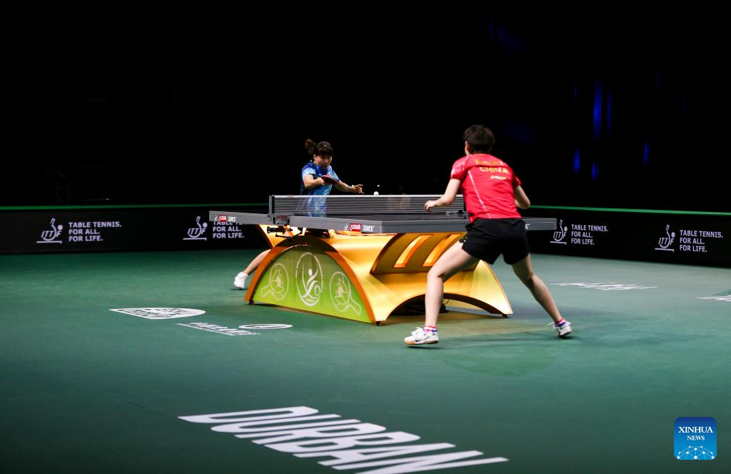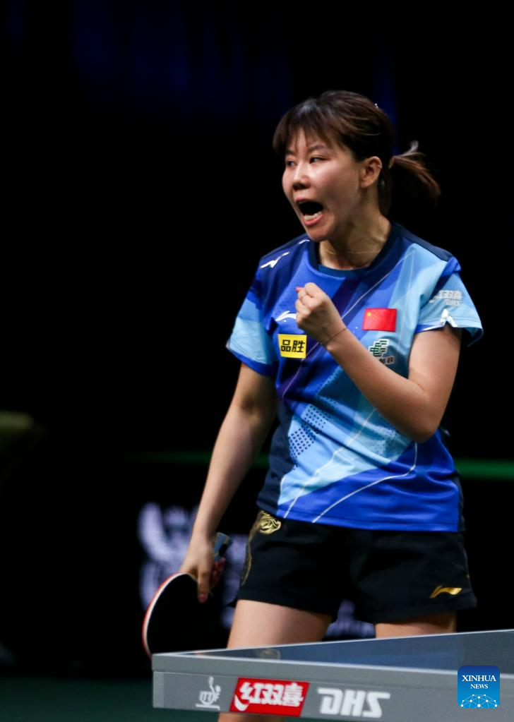 Wang Manyu of China hits a return during the women's singles quarterfinal against her teammate Chen Xingtong at 2023 ITTF Table Tennis World Championships Finals in Durban, South Africa, May 26, 2023. (Xinhua/Zhang Yudong)