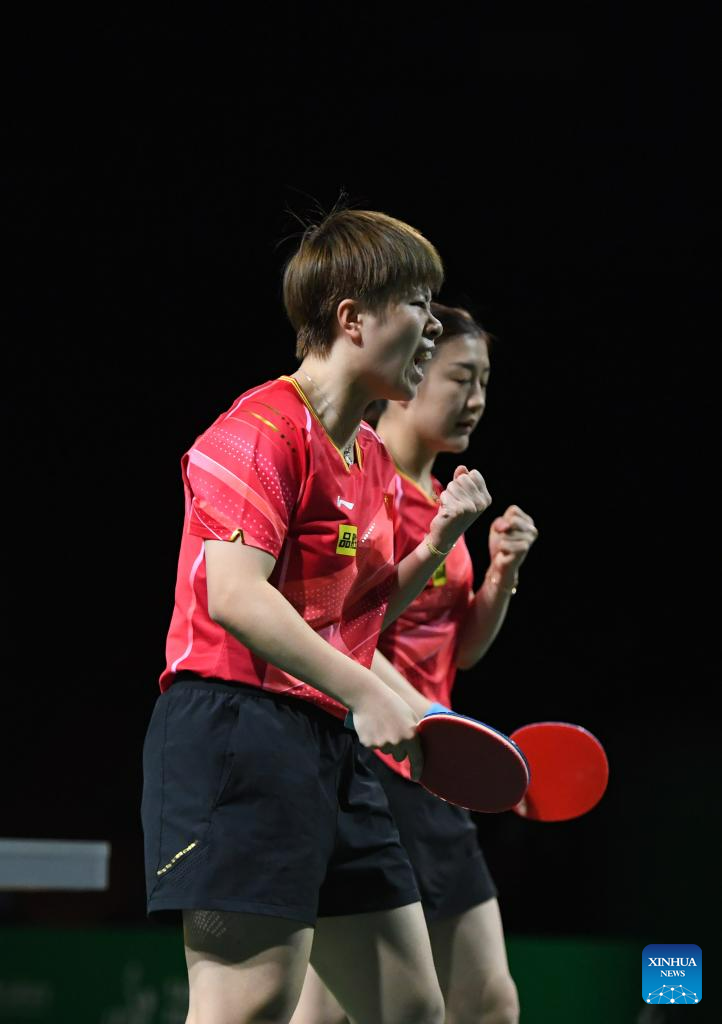 Chen Meng (L)/Wang Yidi of China celebrate during the women's doubles semifinal against Kihara Miyuu /Nagasaki Miyu of Japan at 2023 ITTF Table Tennis World Championships Finals in Durban, South Africa, May 26, 2023. (Xinhua/Li Yahui)