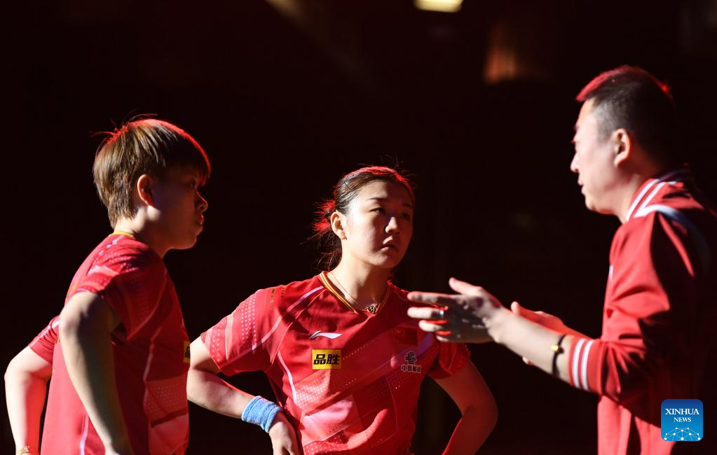 Chen Meng (C)/Wang Yidi (L) of China listen to their coach Ma Lin during the women's doubles semifinal against Kihara Miyuu /Nagasaki Miyu of Japan at 2023 ITTF Table Tennis World Championships Finals in Durban, South Africa, May 26, 2023. (Xinhua/Li Yahui)