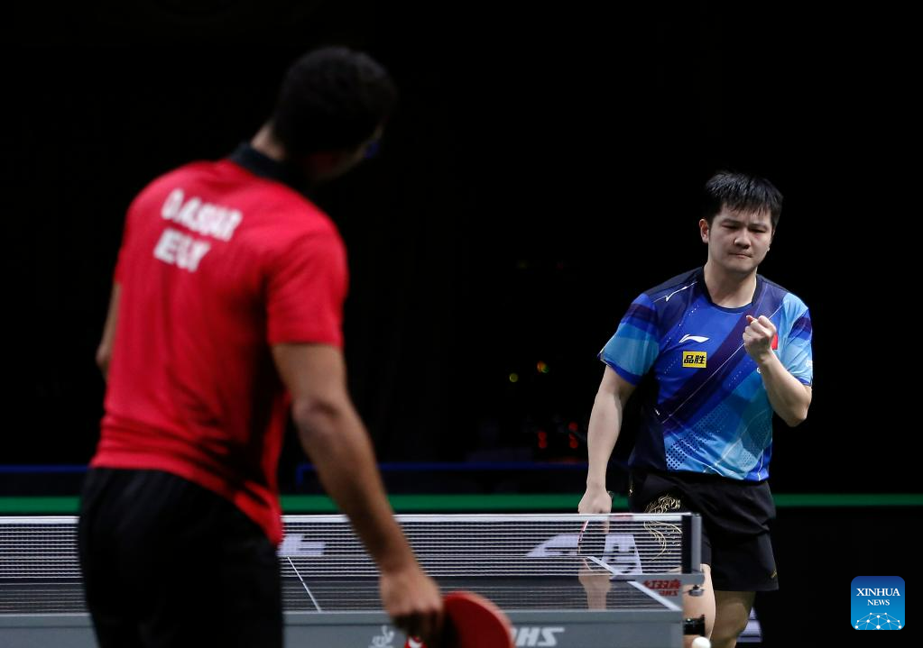 Fan Zhendong of China celebrates during the men's singles quarterfinal against Omar Assar of Egypt at 2023 ITTF Table Tennis World Championships Finals in Durban, South Africa, May 26, 2023. (Xinhua/Wang Dongzhen)