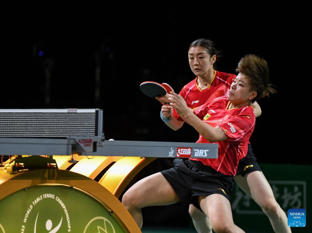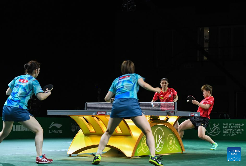 Chen Meng(R)/Wang Yidi of China compete during the women's doubles semifinal against Kihara Miyuu /Nagasaki Miyu of Japan at 2023 ITTF Table Tennis World Championships Finals in Durban, South Africa, May 26, 2023. (Xinhua/Li Yahui)