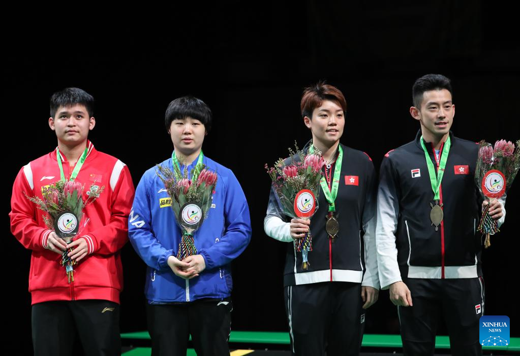 Third-placed Lin Shidong (1st L)/Kuai Man (2nd L) of China and Wong Chun Ting (1st R)/Doo Hoi Kem of China's Hong Kong pose during the mixed doubles awarding ceremony at 2023 ITTF Table Tennis World Championships Finals in Durban, South Africa, May 26, 2023. (Xinhua/Han Xu)