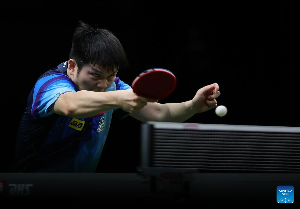 Fan Zhendong of China hits a return during the men's singles quarterfinal against Omar Assar of Egypt at 2023 ITTF Table Tennis World Championships Finals in Durban, South Africa, May 26, 2023. (Xinhua/Wang Dongzhen)