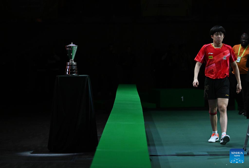 Wang Chuqin of China walks past the trophy after receiving the interview after the mixed doubles final between Wang Chuqin/Sun Yingsha of China and Harimoto Tomokazu/Hayata Hina of Japan at 2023 ITTF Table Tennis World Championships Finals in Durban, South Africa, May 26, 2023. (Xinhua/Tao Xiyi)