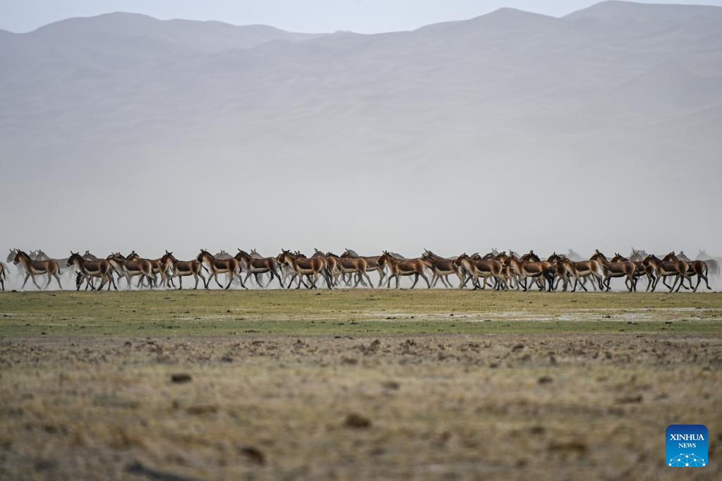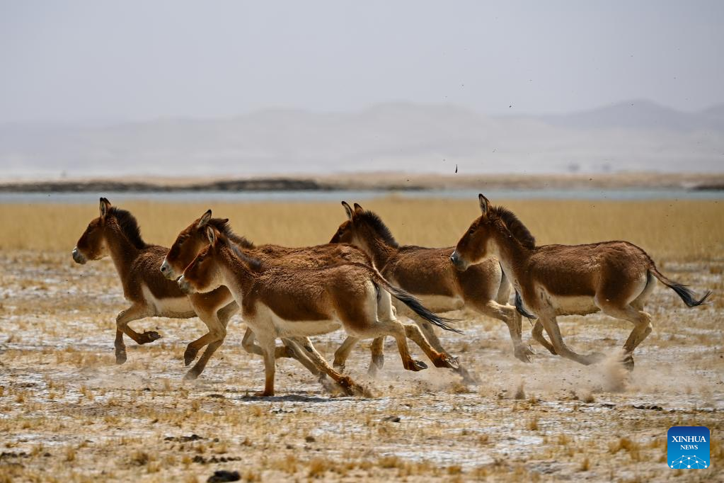 This photo taken on May 23, 2023 shows Tibetan wild donkeys at Altun Mountains National Nature Reserve in northwest China's Xinjiang Uygur Autonomous Region. (Xinhua/Ding Lei)