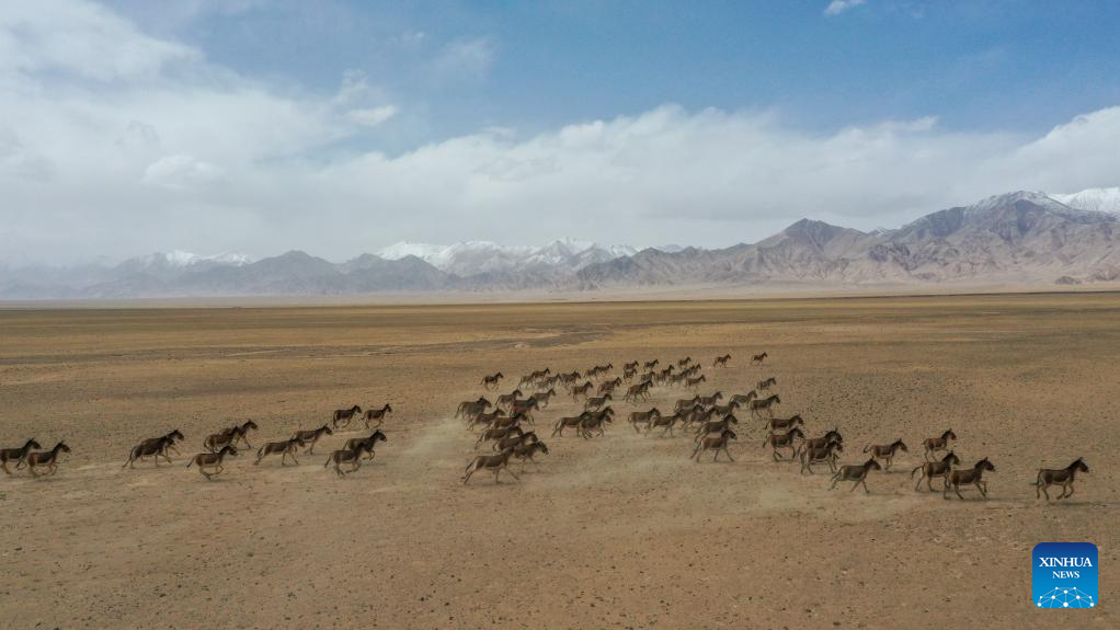 This aerial photo taken on May 23, 2023 shows Tibetan wild donkeys at Altun Mountains National Nature Reserve in northwest China's Xinjiang Uygur Autonomous Region. (Xinhua/Ding Lei)