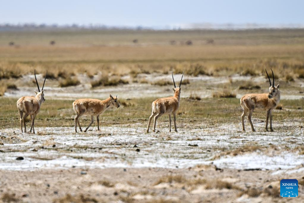 This photo taken on May 23, 2023 shows Tibetan antelopes at Altun Mountains National Nature Reserve in northwest China's Xinjiang Uygur Autonomous Region. (Xinhua/Ding Lei)