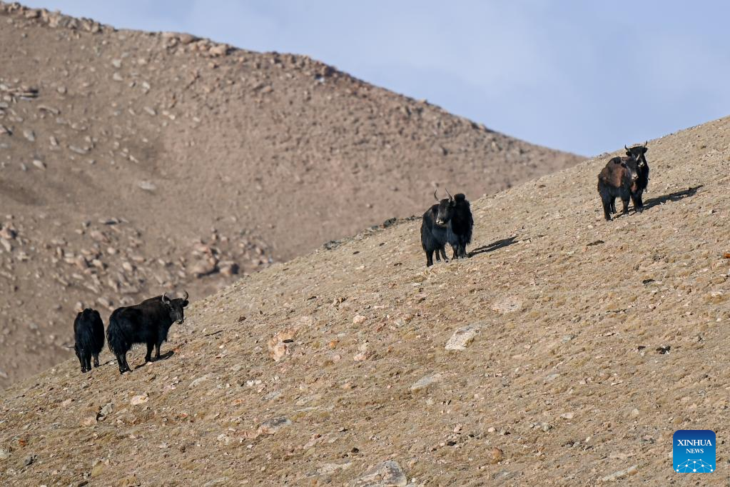 This photo taken on May 23, 2023 shows wild yaks at Altun Mountains National Nature Reserve in northwest China's Xinjiang Uygur Autonomous Region. (Xinhua/Ding Lei)