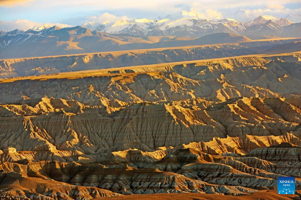 This photo taken on May 25, 2023 shows the landscape of earth forest at sunset in Zanda County, southwest China's Tibet Autonomous Region. Zanda is famous for the unique landscape of earth forest, which was formed by geological movement and soil erosion. These "forests" look yellowish, but the color varies in different parts. (Xinhua/Fei Maohua)