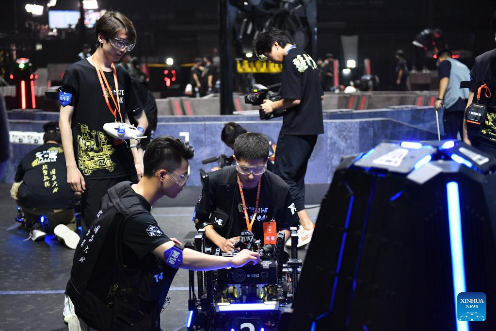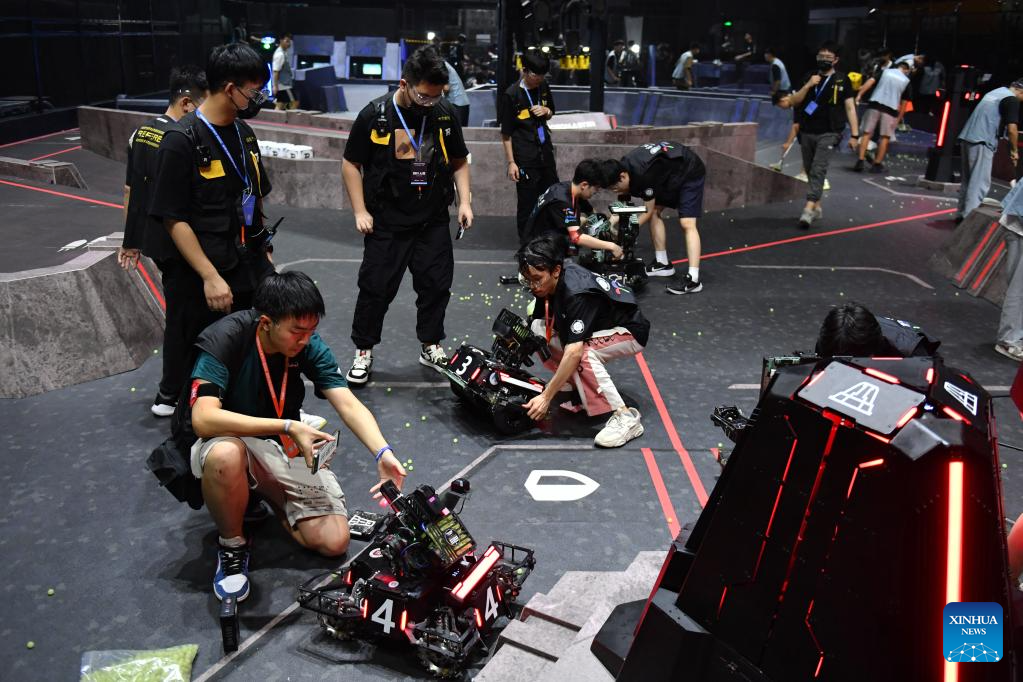 Contestants of team TOE from Dalian Jiaotong University test their robots during the RoboMaster 2023 University Championship Regional Competition (South China) in Changsha, central China's Hunan Province, May 28, 2023. The four-day regional competition concluded in Changsha on Sunday, with team RobotPilots from Shenzhen University winning the first place and team TOE from Dalian Jiaotong University being the second. (Xinhua/Chen Zhenhai)