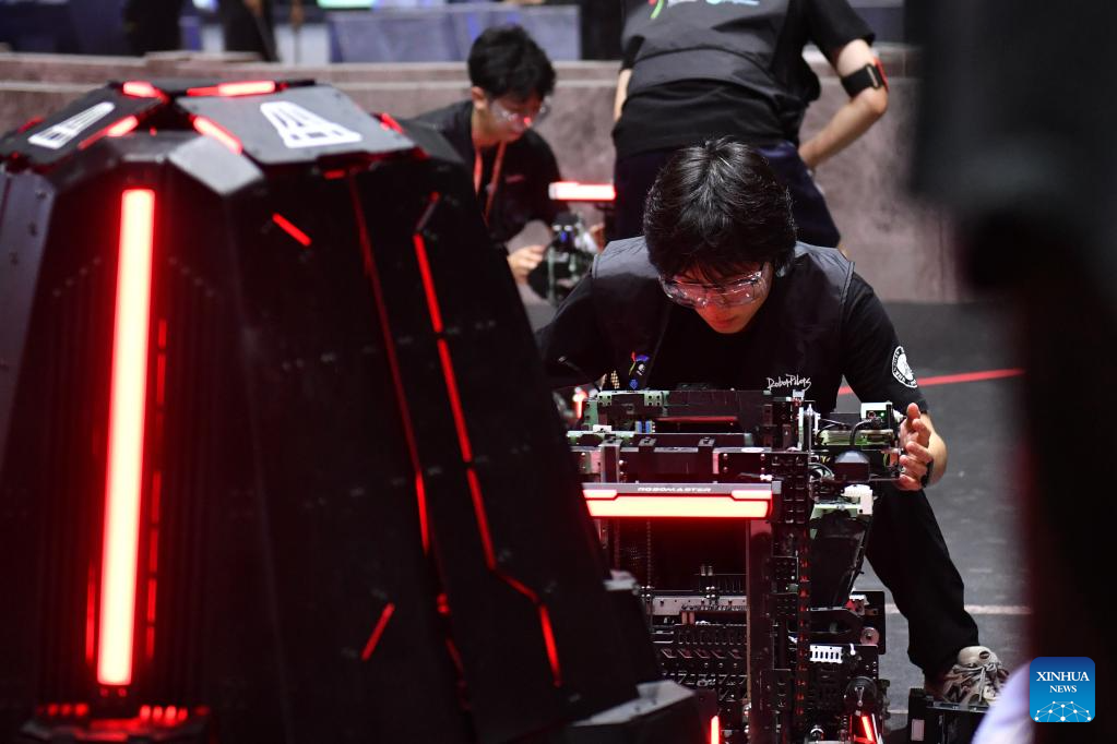 A contestant of team TOE from Dalian Jiaotong University tests a robot during the RoboMaster 2023 University Championship Regional Competition (South China) in Changsha, central China's Hunan Province, May 28, 2023. The four-day regional competition concluded in Changsha on Sunday, with team RobotPilots from Shenzhen University winning the first place and team TOE from Dalian Jiaotong University being the second. (Xinhua/Chen Zhenhai)