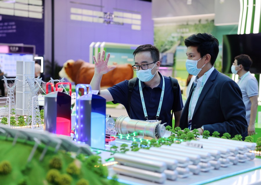 A visitor learns about compressed air energy storage technology at the exhibition center of Zhongguancun National Independent Innovation Demonstration Zone in Beijing, capital of China, May 26, 2023. (Xinhua/Zhang Chenlin)
