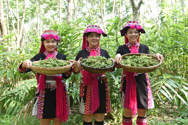 Villagers show freshly picked fruits of Alpinia oxyphylla Miq. (Photo/Lin Xiaodan)