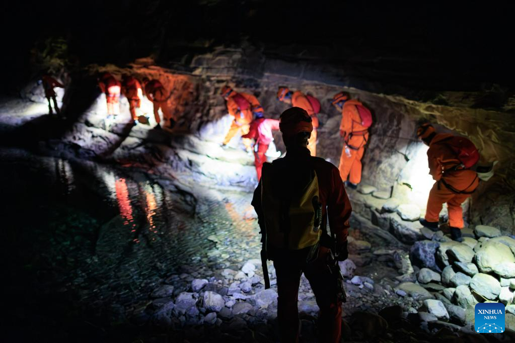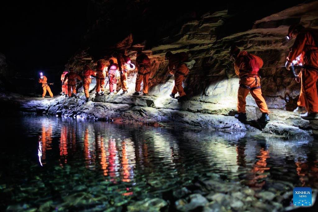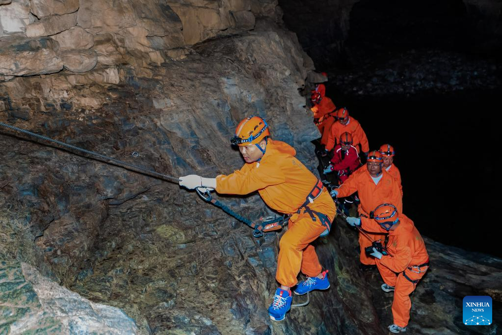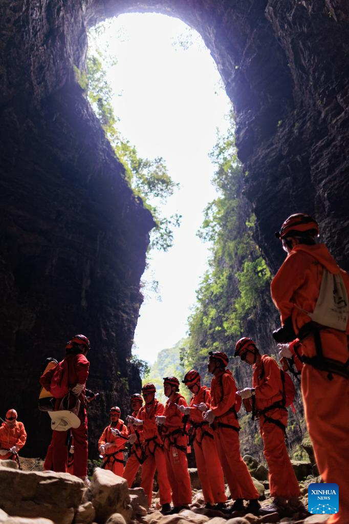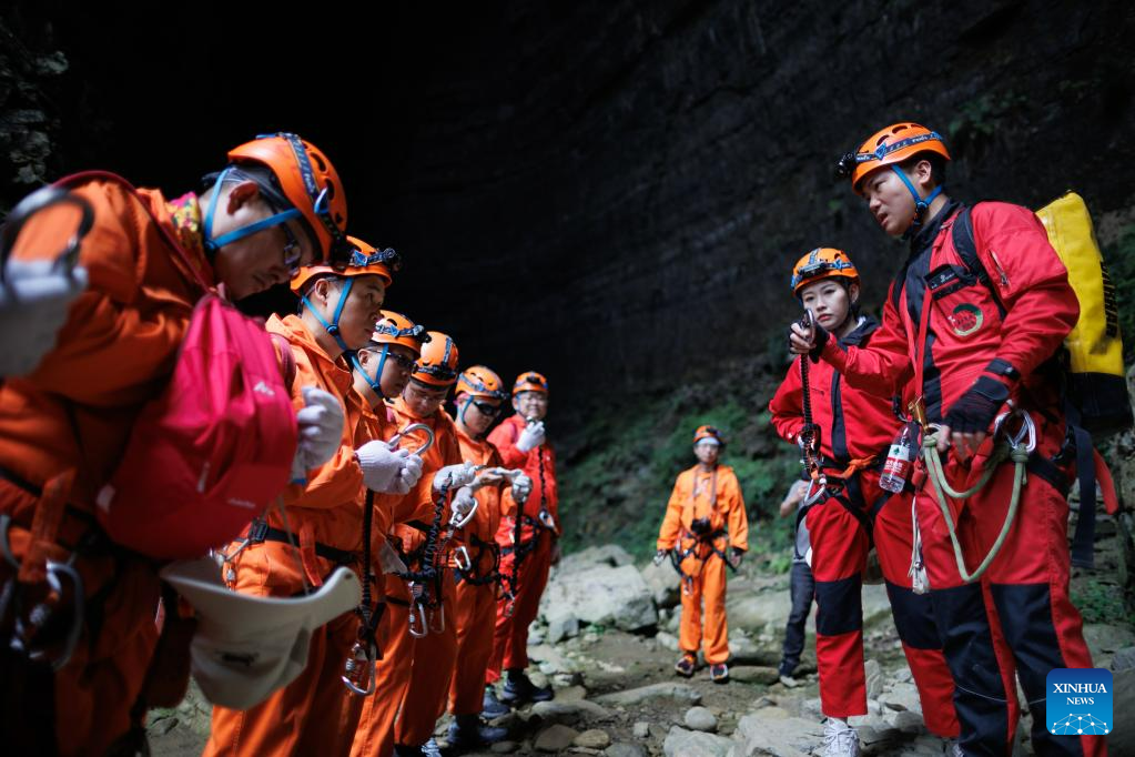 Tourists attend a training session before exploring a karst cave in Suiyang County, southwest China's Guizhou Province, May 17, 2023. As home to Shuanghe Cave, the longest cave in Asia, Suiyang County has been developing its tourism industry with abundant cave resources in recent year, aiming at meeting diversified demand of tourists. (Xinhua/Liu Xu)