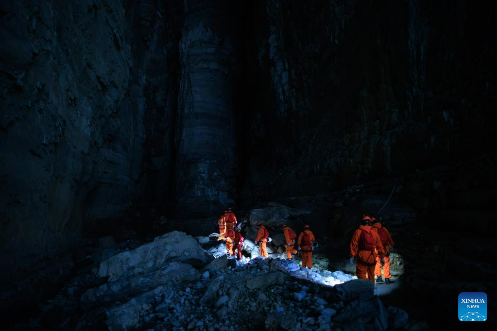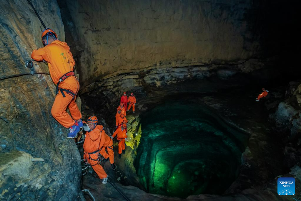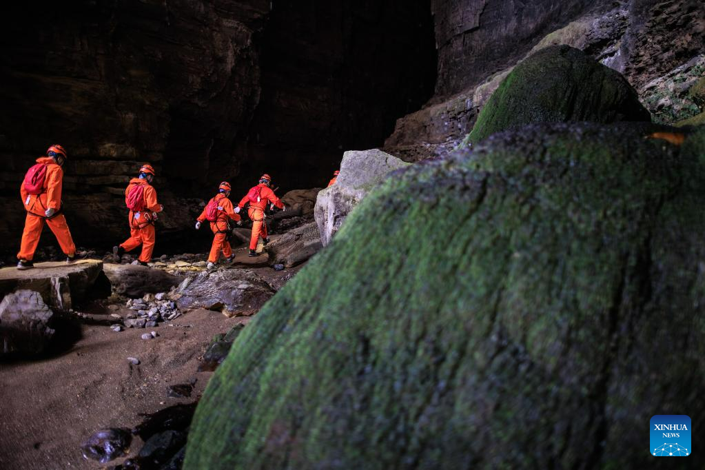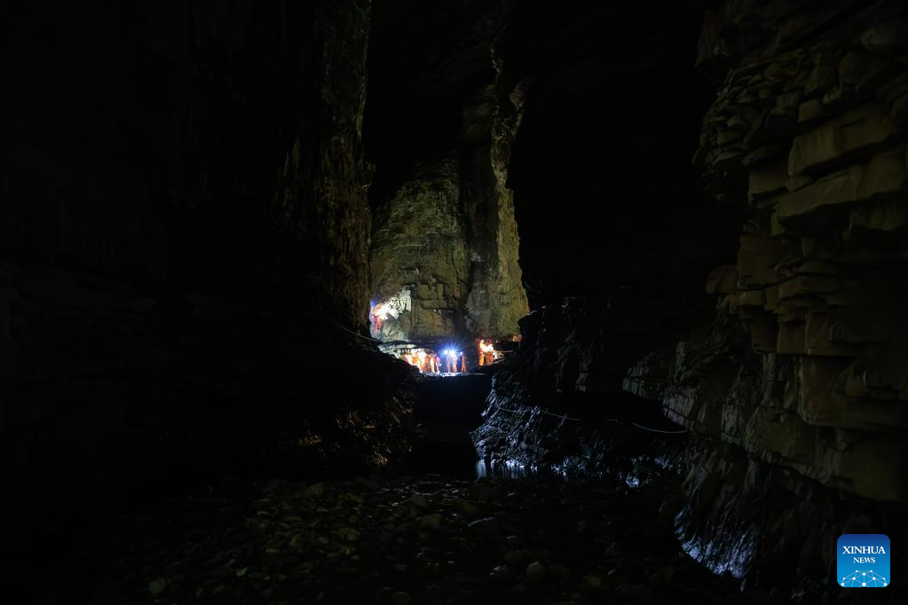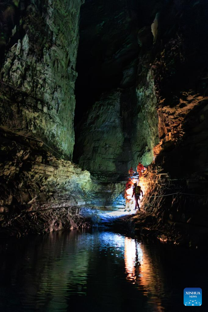 Tourists explore a karst cave in Suiyang County, southwest China's Guizhou Province, May 17, 2023. As home to Shuanghe Cave, the longest cave in Asia, Suiyang County has been developing its tourism industry with abundant cave resources in recent year, aiming at meeting diversified demand of tourists. (Xinhua/Liu Xu)