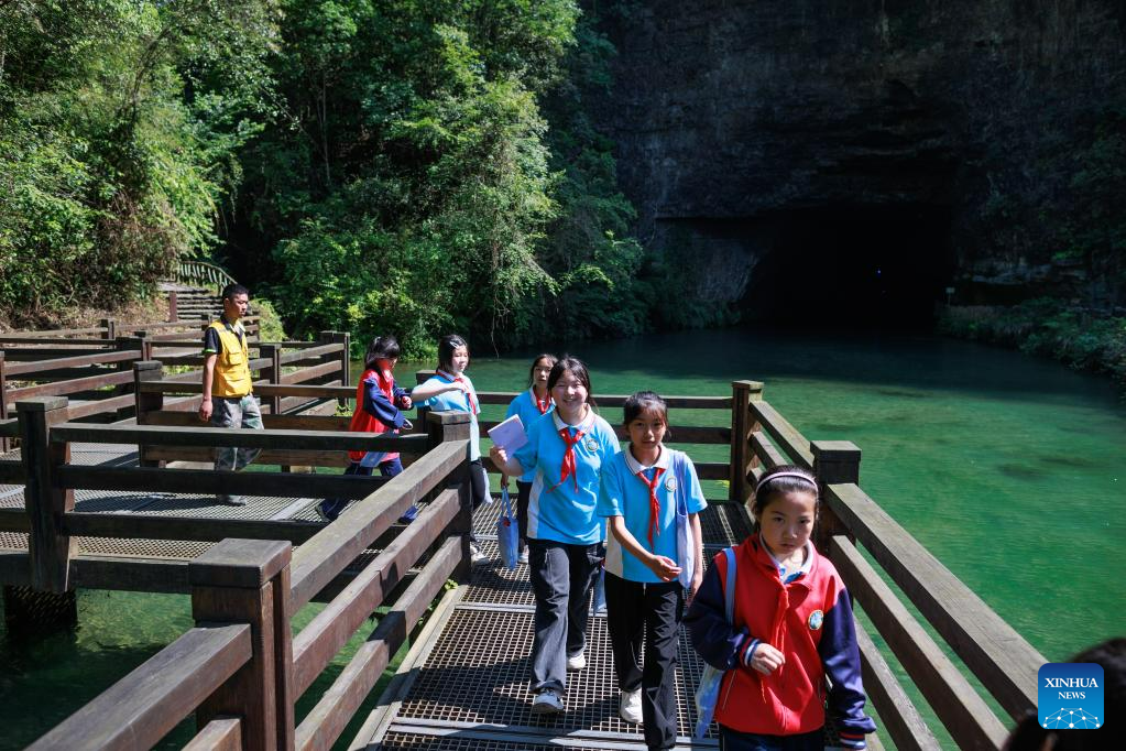 Students visit Shuanghe Cave national geological park in Suiyang County, southwest China's Guizhou Province, May 16, 2023. As home to Shuanghe Cave, the longest cave in Asia, Suiyang County has been developing its tourism industry with abundant cave resources in recent year, aiming at meeting diversified demand of tourists. (Xinhua/Liu Xu)