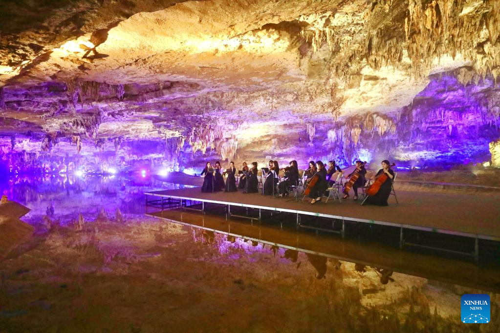 A concert is held in a karst cave in Suiyang County, southwest China's Guizhou Province, May 4, 2023. As home to Shuanghe Cave, the longest cave in Asia, Suiyang County has been developing its tourism industry with abundant cave resources in recent year, aiming at meeting diversified demand of tourists. (Xinhua)