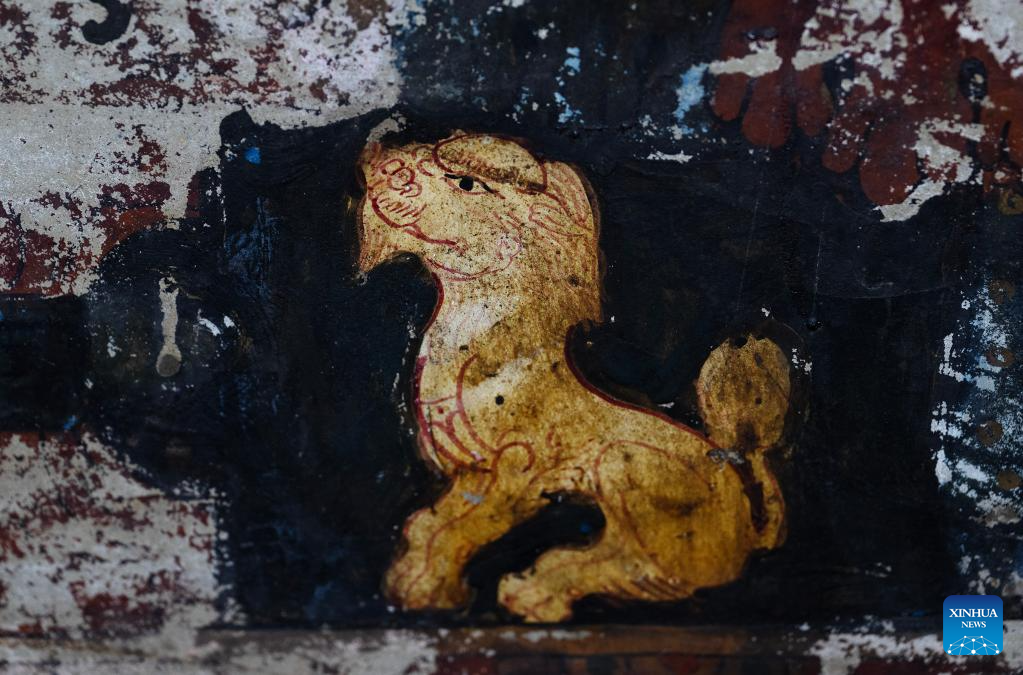This photo taken on May 26, 2023 shows part of a mural in a grotto in Zanda County of Ngari Prefecture, southwest China's Tibet Autonomous Region. (Xinhua/Fei Maohua)