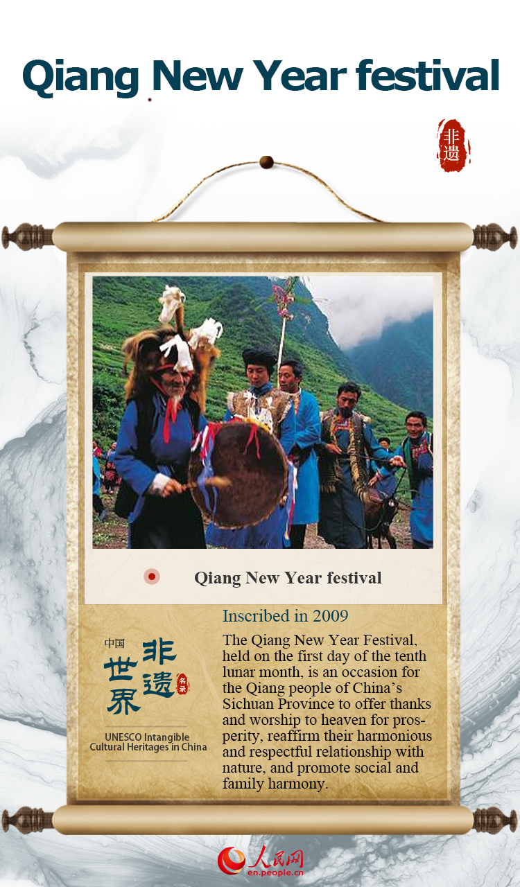 The item, "Qiang New Year festival" was inscribed on UNESCO's List of Intangible Cultural Heritage in Need of Urgent Safeguarding in 2009.