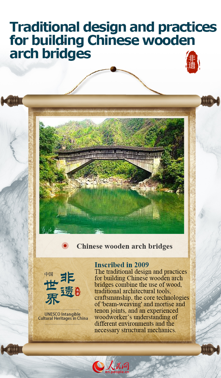 The item, "Traditional design and practices for building Chinese wooden arch bridges" was inscribed on UNESCO's List of Intangible Cultural Heritage in Need of Urgent Safeguarding in 2009.