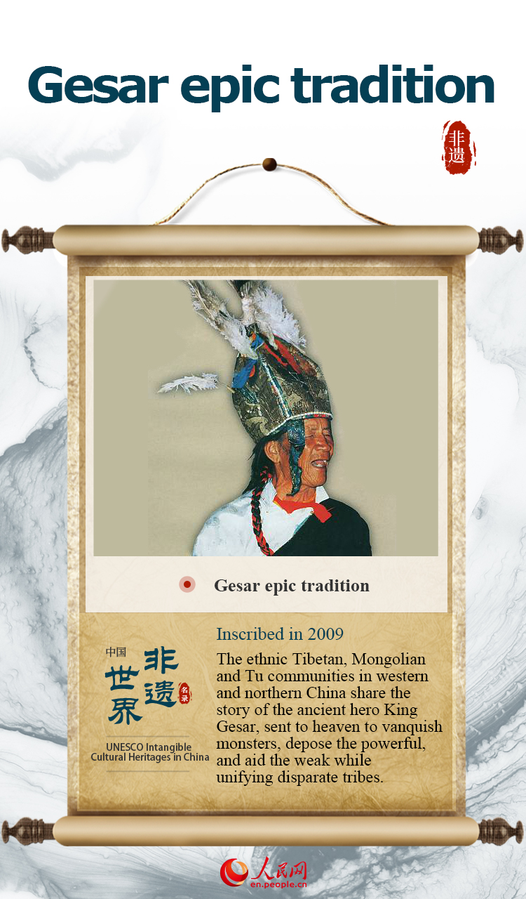 The item, "Gesar epic tradition" was inscribed on UNESCO's Representative List of the Intangible Cultural Heritage of Humanity in 2009.