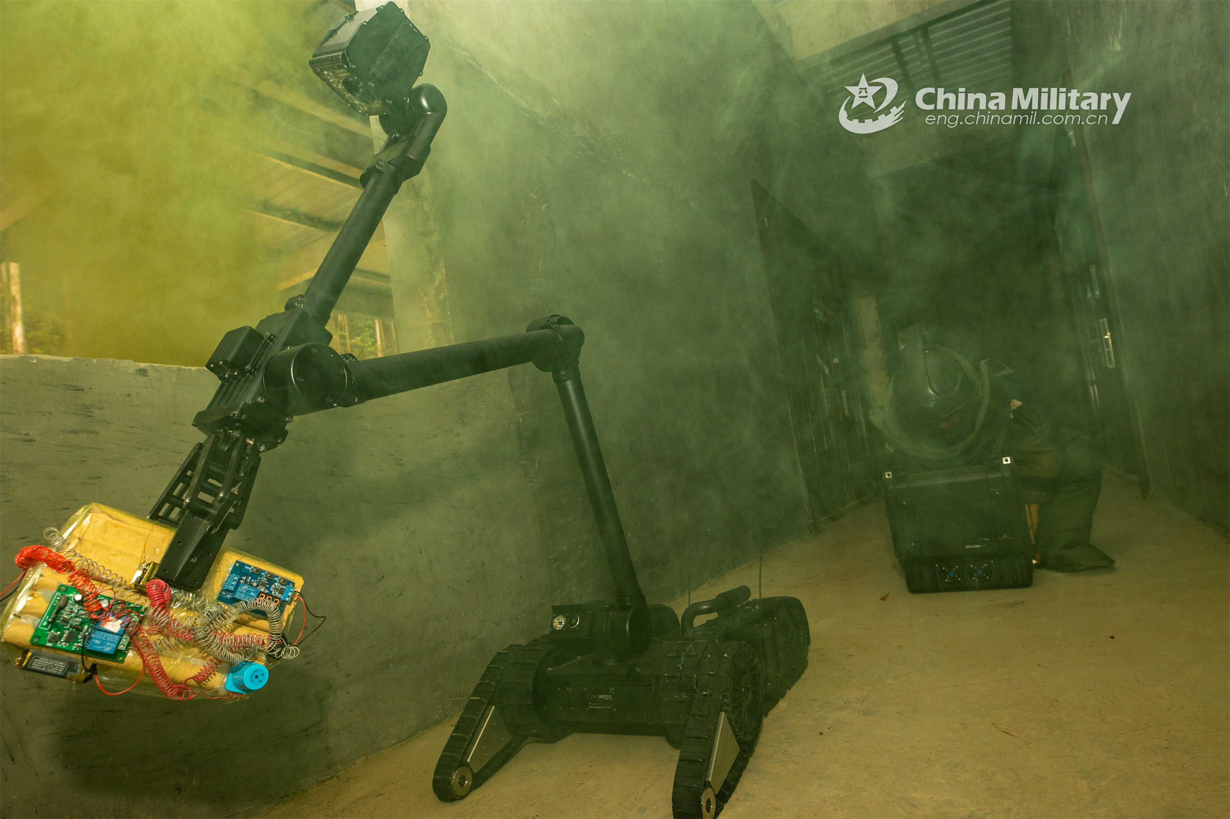 A soldier assigned to a mobile detachment under the Chinese People's Armed Police (PAP) Force Guangxi Corps uses an explosive ordnance disposal (EOD) robot to disassemble a mock exploder during an EOD training exercise in late May, 2023. (eng.chinamil.com.cn/Photo by Liu Ming)
