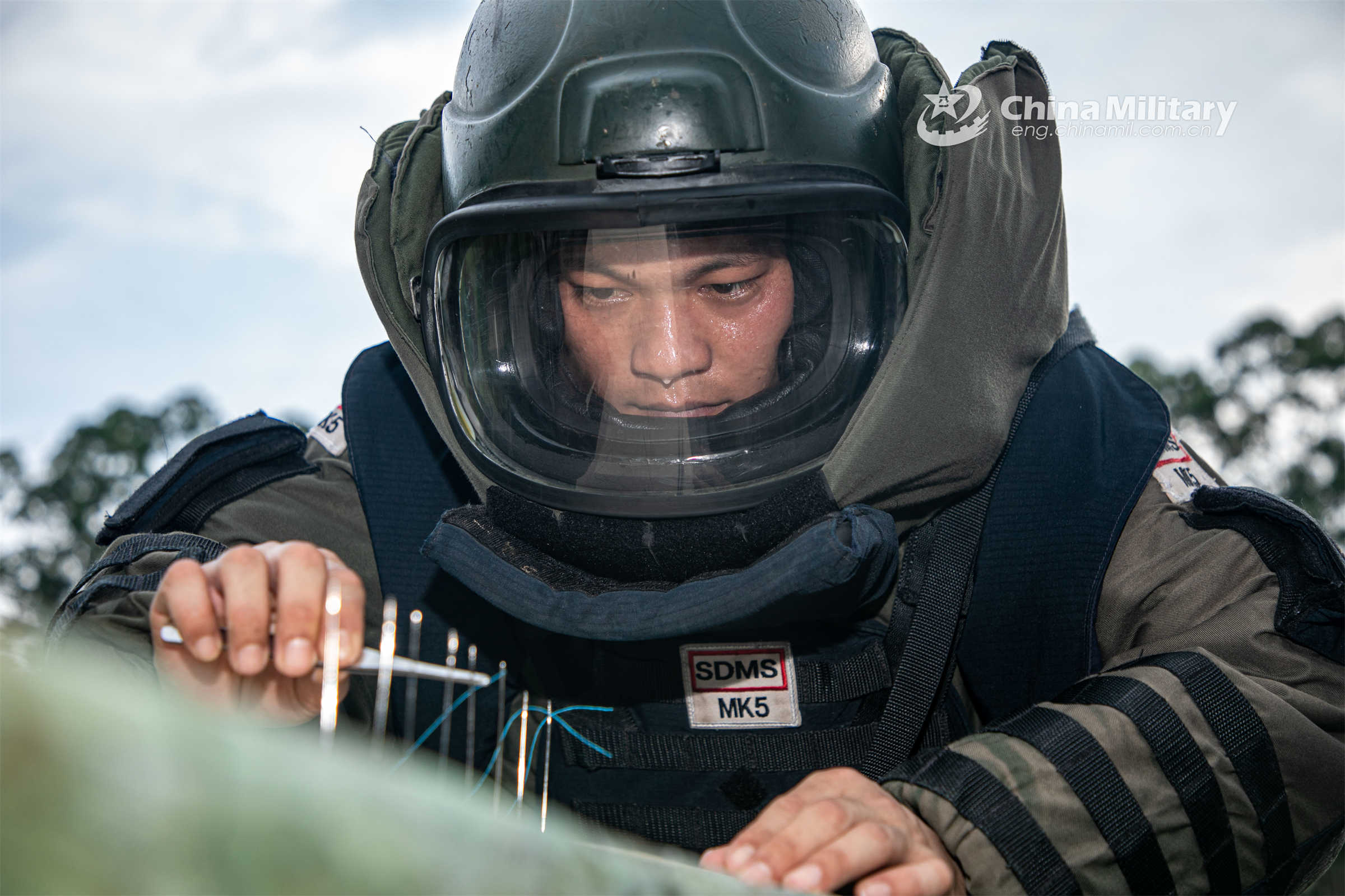 Wearing the heavy protective gear, a soldier assigned to a mobile detachment under the Chinese People's Armed Police (PAP) Force Guangxi Corps threads the needles during an explosive ordnance disposal (EOD) training exercise in late May, 2023. (eng.chinamil.com.cn/Photo by Liu Ming)