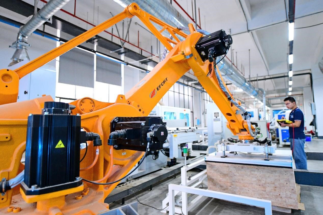 A man controls a robotic arm to manufacture furniture parts in an intelligent factory in Nankang district, Ganzhou, east China's Jiangxi province. (People's Daily Online/Zhu Haipeng)