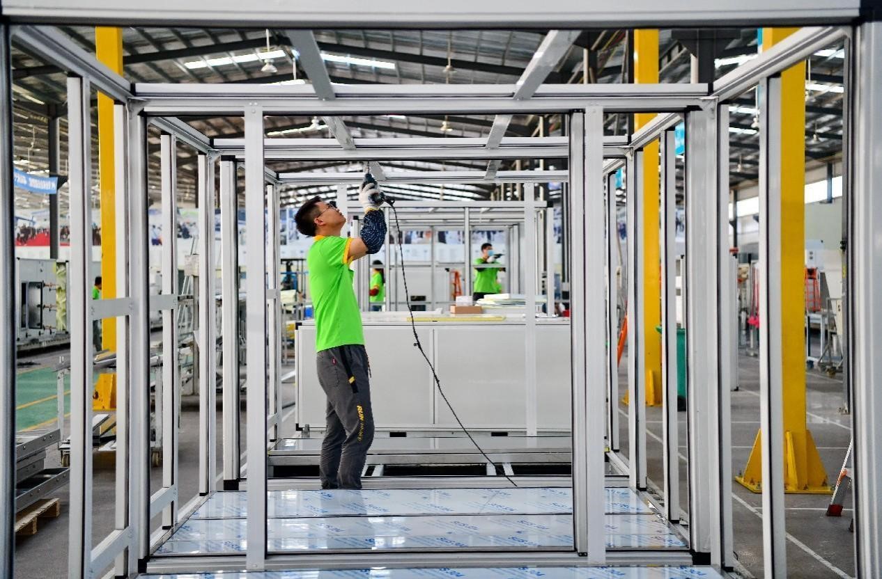 Workers manufacture parts of central air conditioners to be exported in a workshop in Ganzhou, east China's Jiangxi province. (People's Daily Online/Zhu Haipeng)