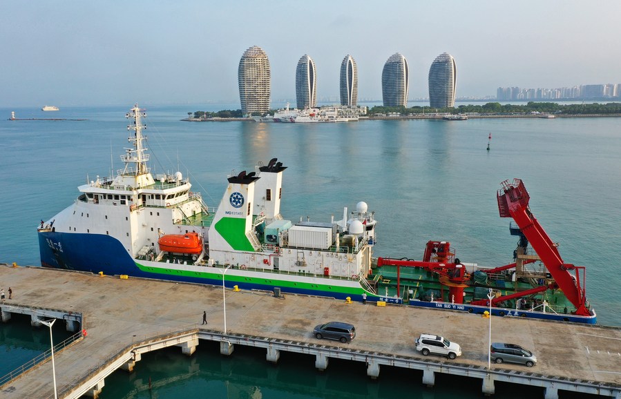 China's scientific research ship Tansuo-1 carrying the crewed submersible Shenhai Yongshi (Deep Sea Warrior) is seen in Sanya, south China's Hainan Province, after completing the first archaeological survey of the No. 1 shipwreck, located near the northwest continental slope of the South China Sea, May 21, 2023. (Xinhua/Guo Cheng)