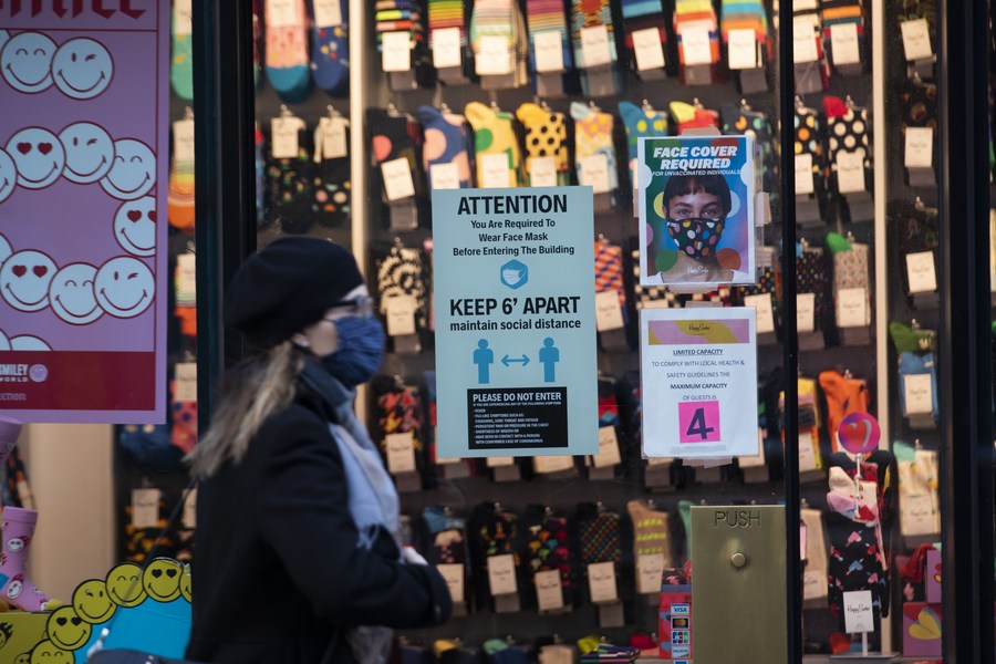 Notices of measures against COVID-19 are seen on a door of a store in New York, the United States, Feb. 14, 2022. (Xinhua/Wang Ying)