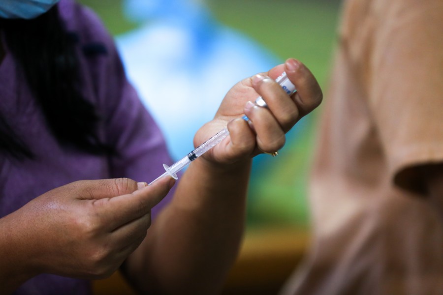 A health worker prepares a dose of COVID-19 vaccine at a school in Yangon, Myanmar, Jan. 16, 2023. (Photo by Myo Kyaw Soe/Xinhua)