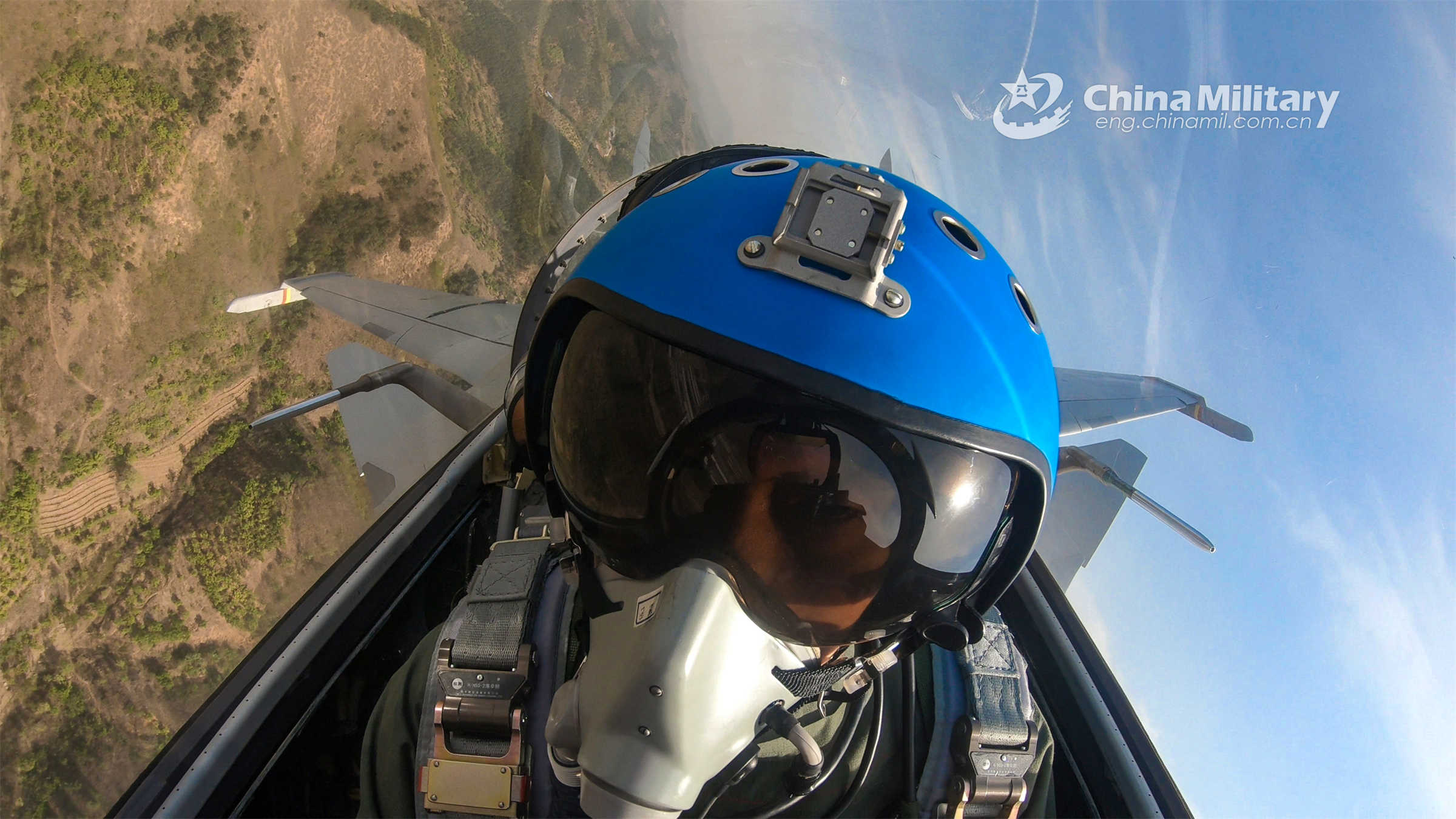 A pilot assigned to a regiment under the PLA Naval Aviation University flies the fighter jet over an airport on the shore of the Bohai Sea during a low-altitude tactical maneuver training exercise in early May, 2023. (eng.chinamil.com.cn/Photo by Ni Shuai)