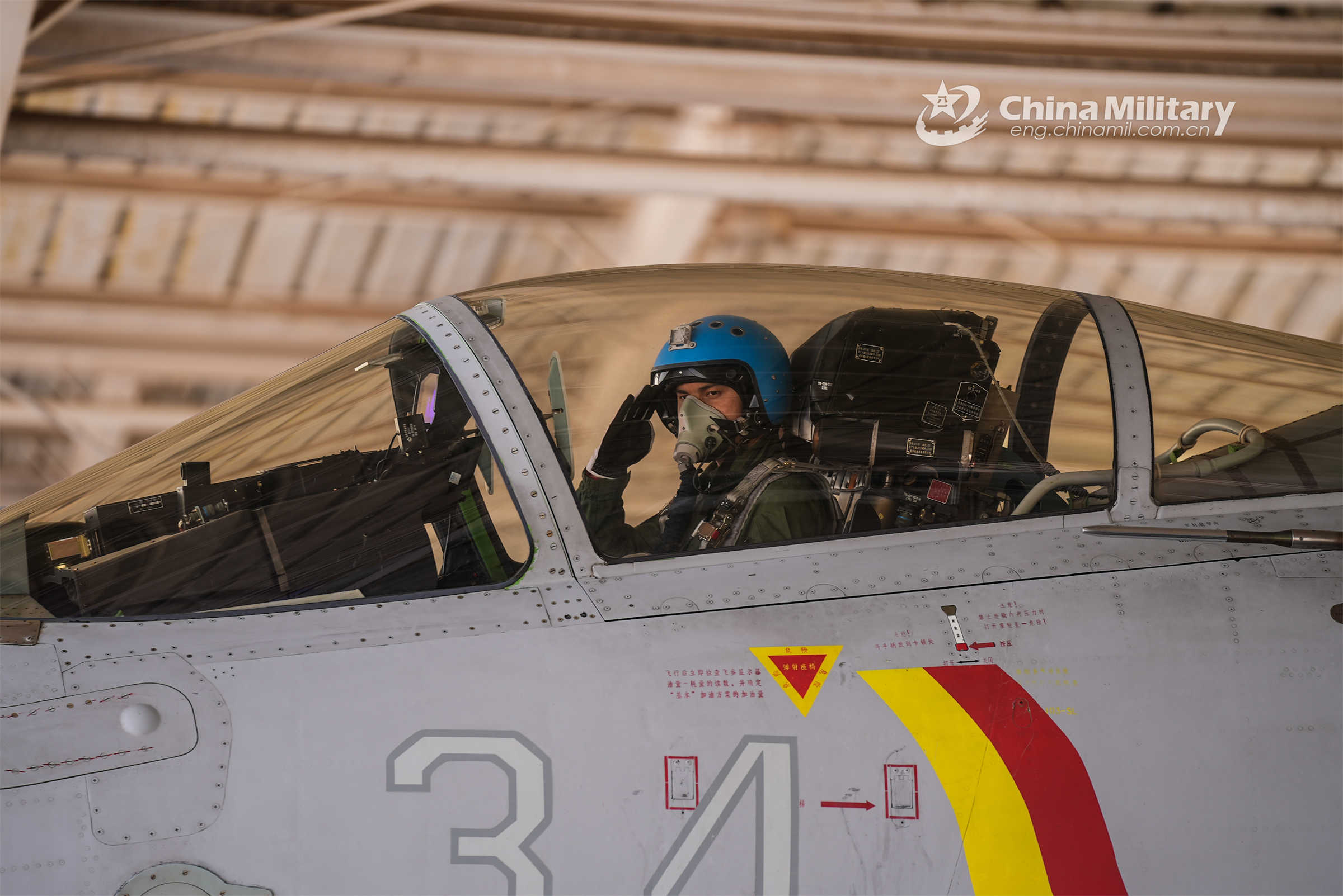 A pilot assigned to a regiment under the PLA Naval Aviation University sits in the cockpit at an airport on the shore of the Bohai Sea during a low-altitude tactical maneuver training exercise in early May, 2023. (eng.chinamil.com.cn/Photo by Ni Shuai)