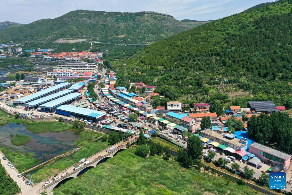 This aerial photo taken on May 31, 2023 shows the local cherry market in Yanya Township of Yiyuan County, east China's Shandong Province. (Xinhua/Zhu Zheng)