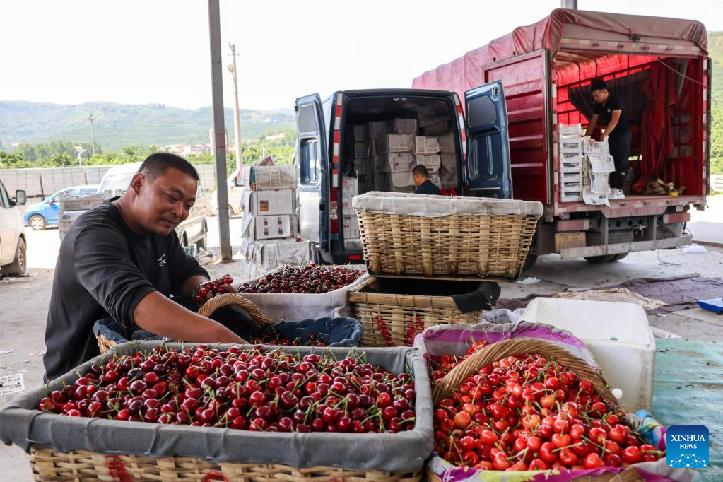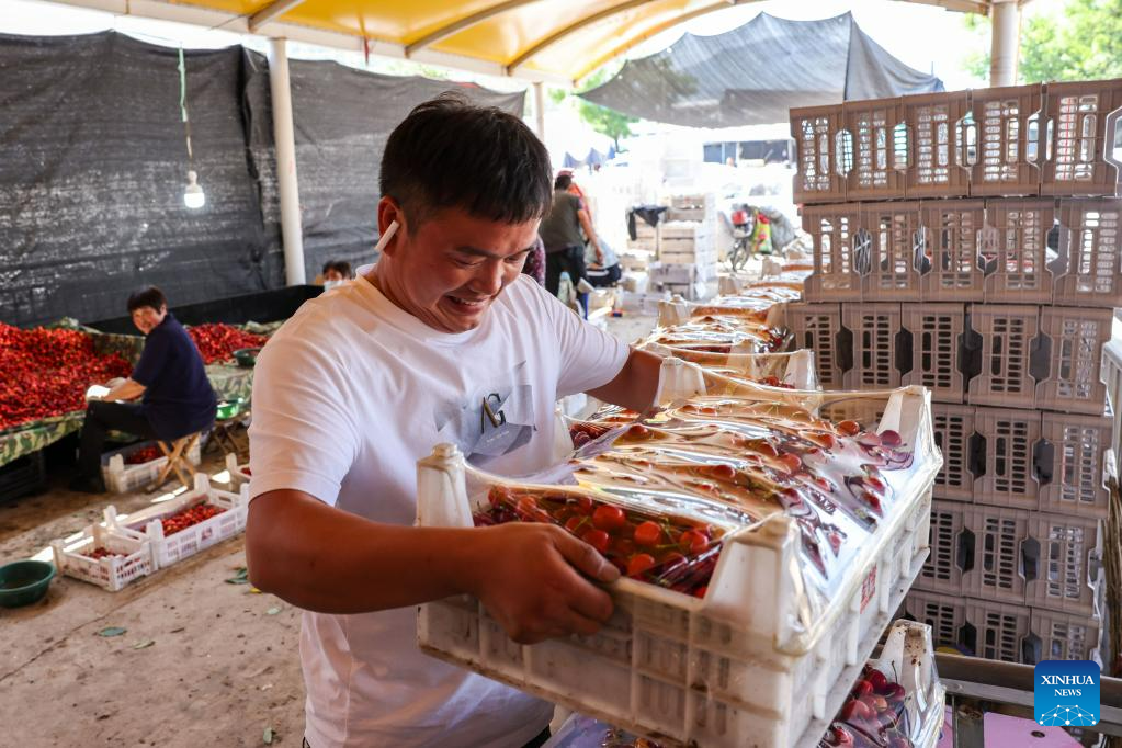 Fruit farmers trade at the local cherry market in Yanya Township of Yiyuan County, east China's Shandong Province, May 31, 2023. (Xinhua/Zhu Zheng)