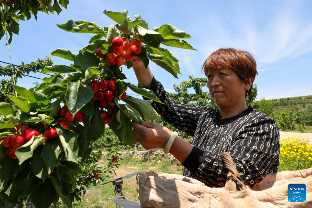 A fruit farmer picks cherries in Yanya Township of Yiyuan County, east China's Shandong Province, May 31, 2023.