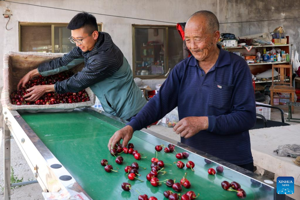 Fruit farmers sort freshly picked cherries with a machine in Yanya Township of Yiyuan County, east China's Shandong Province, May 31, 2023. (Xinhua/Zhu Zheng)