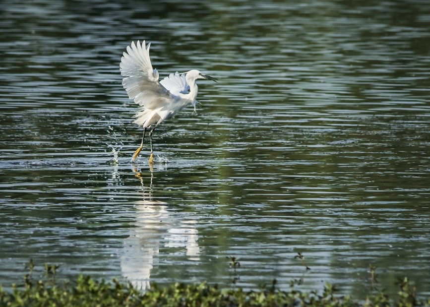 An egret takes off from water in Henan Anyang Zhanghe Canyon National Wetlands Park in Anyang city, central China's Henan Province. (Photo/Niu Wentang)