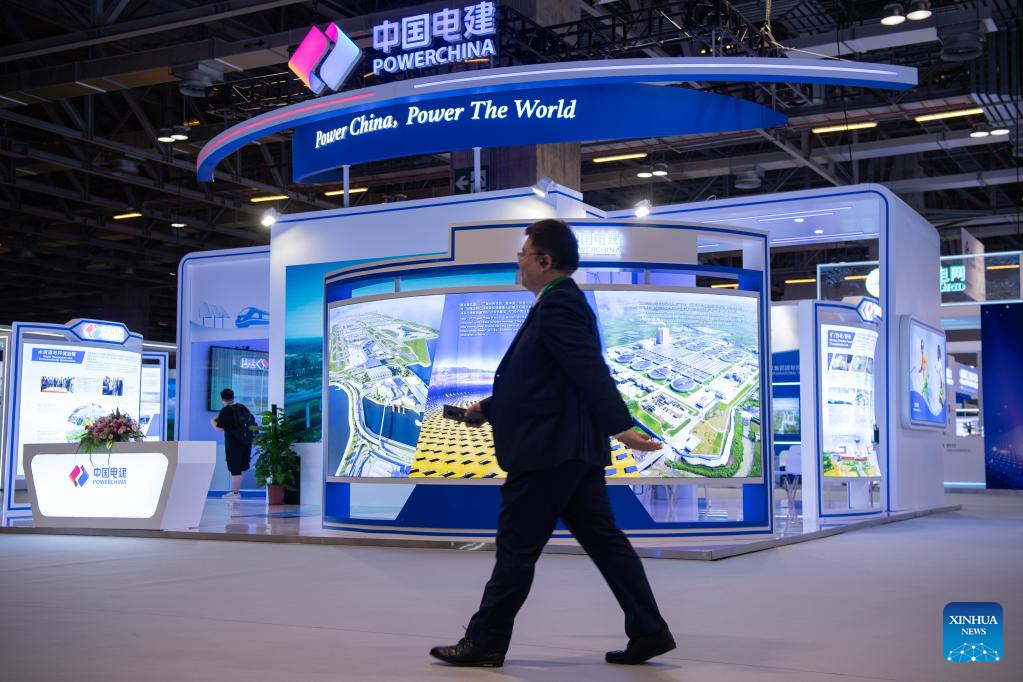 An attendee walks past the exhibition area of the Power Construction Corporation of China during the 14th International Infrastructure Investment and Construction Forum in Macao, south China, June 1, 2023. (Xinhua/Cheong Kam Ka)