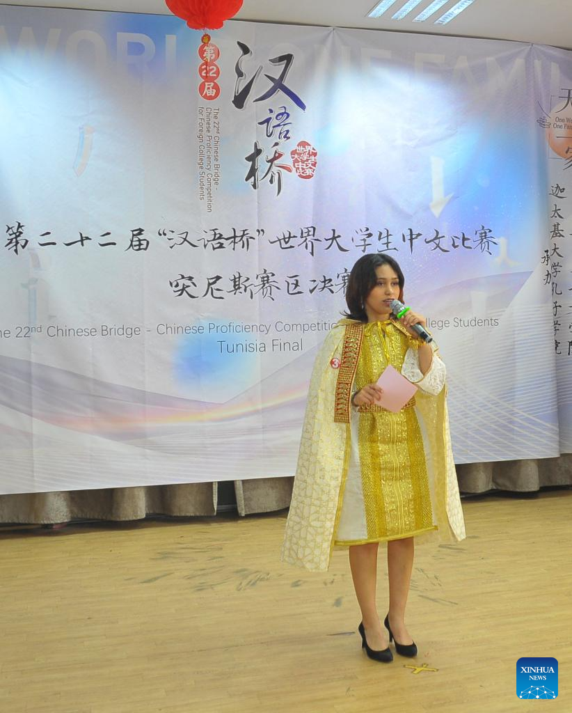 A contestant takes part in the "Chinese Bridge" language proficiency competition at the Confucius Institute of the University of Carthage in Tunis, Tunisia on May 31, 2023. (Photo by Adel Ezzine/Xinhua)