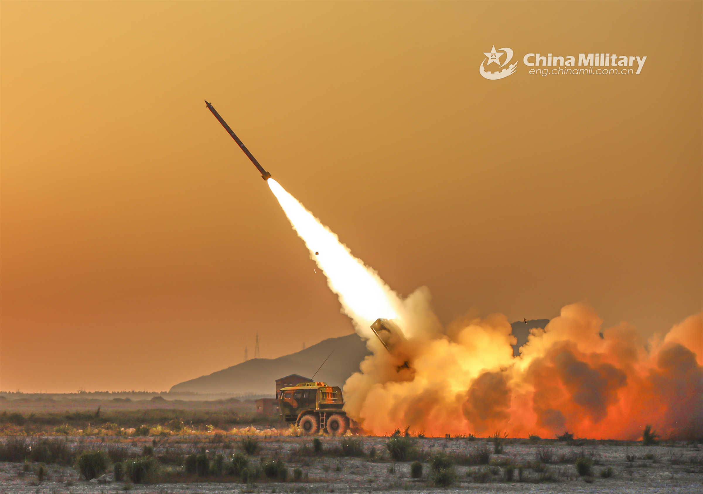 Long-range multiple rocket launcher systems (MRLS) attached to a brigade under the PLA 72nd Group Army fire at mock targets during a live-fire exercise in unfamiliar terrain on May 10, 2023. (eng.chinamil.com.cn/Photo by Zhuang Haoning)