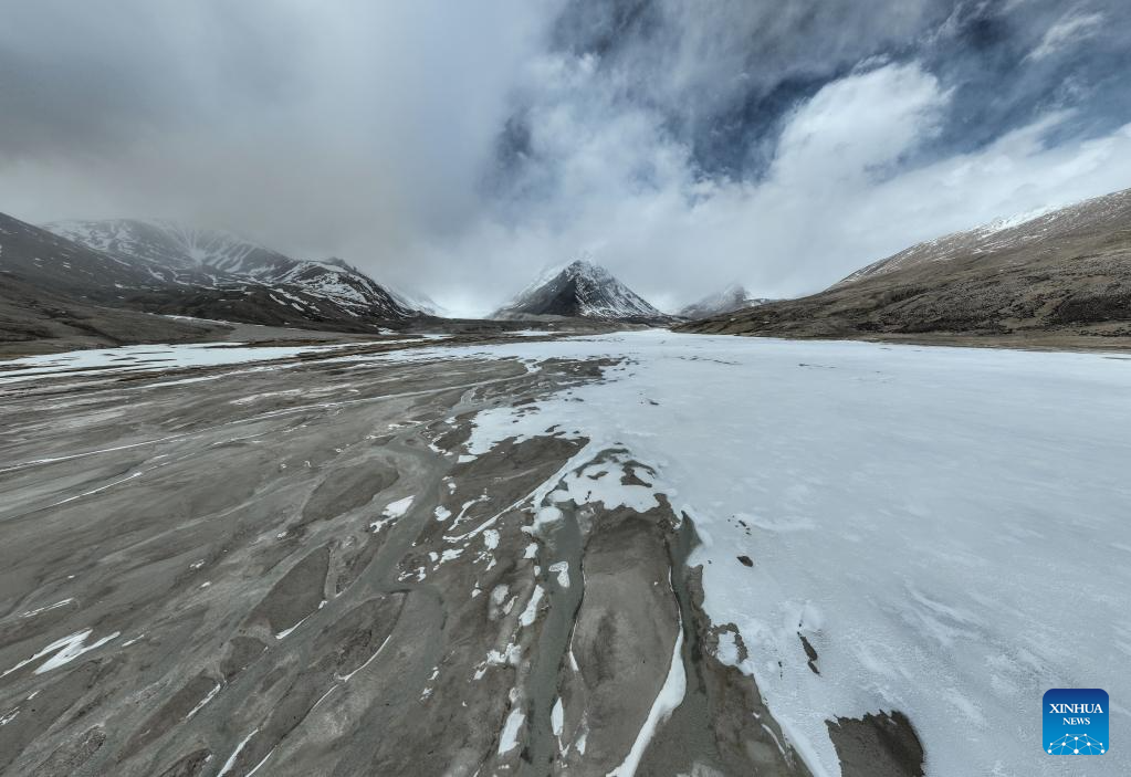 This photo taken on May 31, 2023 shows the river valley at the foot of the Gyaimaryangzhong Glacier in southwest China's Tibet Autonomous Region. The Gyaimaryangzhong Glacier is the source of the Yarlung Zangbo River, China's longest plateau river. (Xinhua/Fei Maohua)