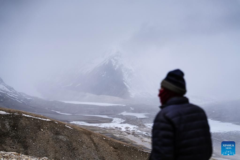 A local herdsman looks at the Gyaimaryangzhong Glacier through binoculars in southwest China's Tibet Autonomous Region, May 31, 2023. The Gyaimaryangzhong Glacier is the source of the Yarlung Zangbo River, China's longest plateau river. (Xinhua/Jigme Dorje)