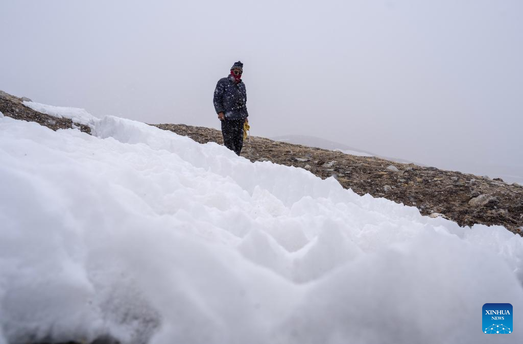 A local herdsman collects trash near the Gyaimaryangzhong Glacier in southwest China's Tibet Autonomous Region, May 31, 2023. The Gyaimaryangzhong Glacier is the source of the Yarlung Zangbo River, China's longest plateau river. (Xinhua/Fei Maohua)